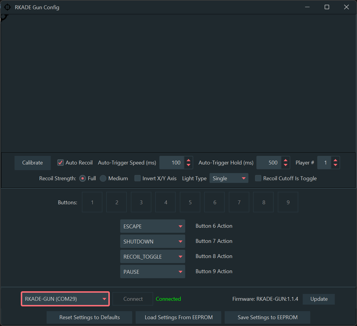 Can be configured for recoil synchronized to the trigger press. Supports auto-fire on trigger hold. Allows for up to 8 buttons in addition to the trigger, including 4 actions that can be mapped (Escape, Pause, PC Shutdown, Toggle Recoil).